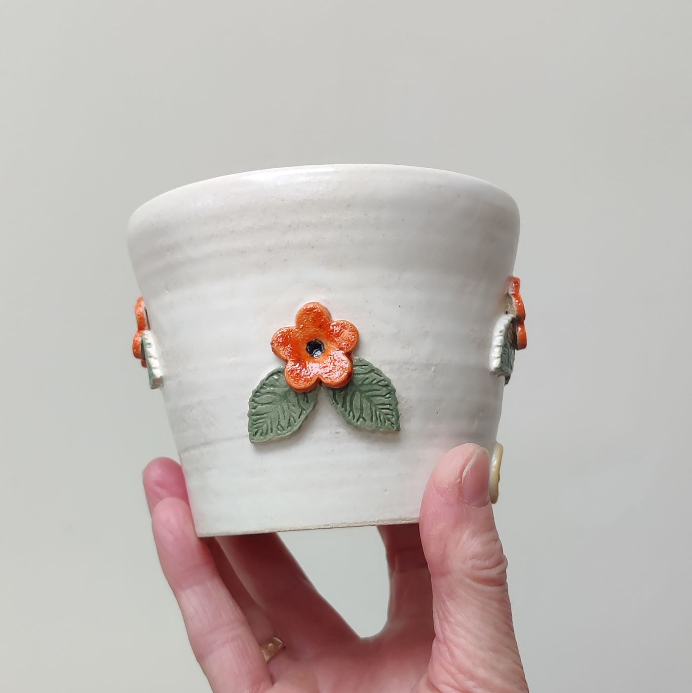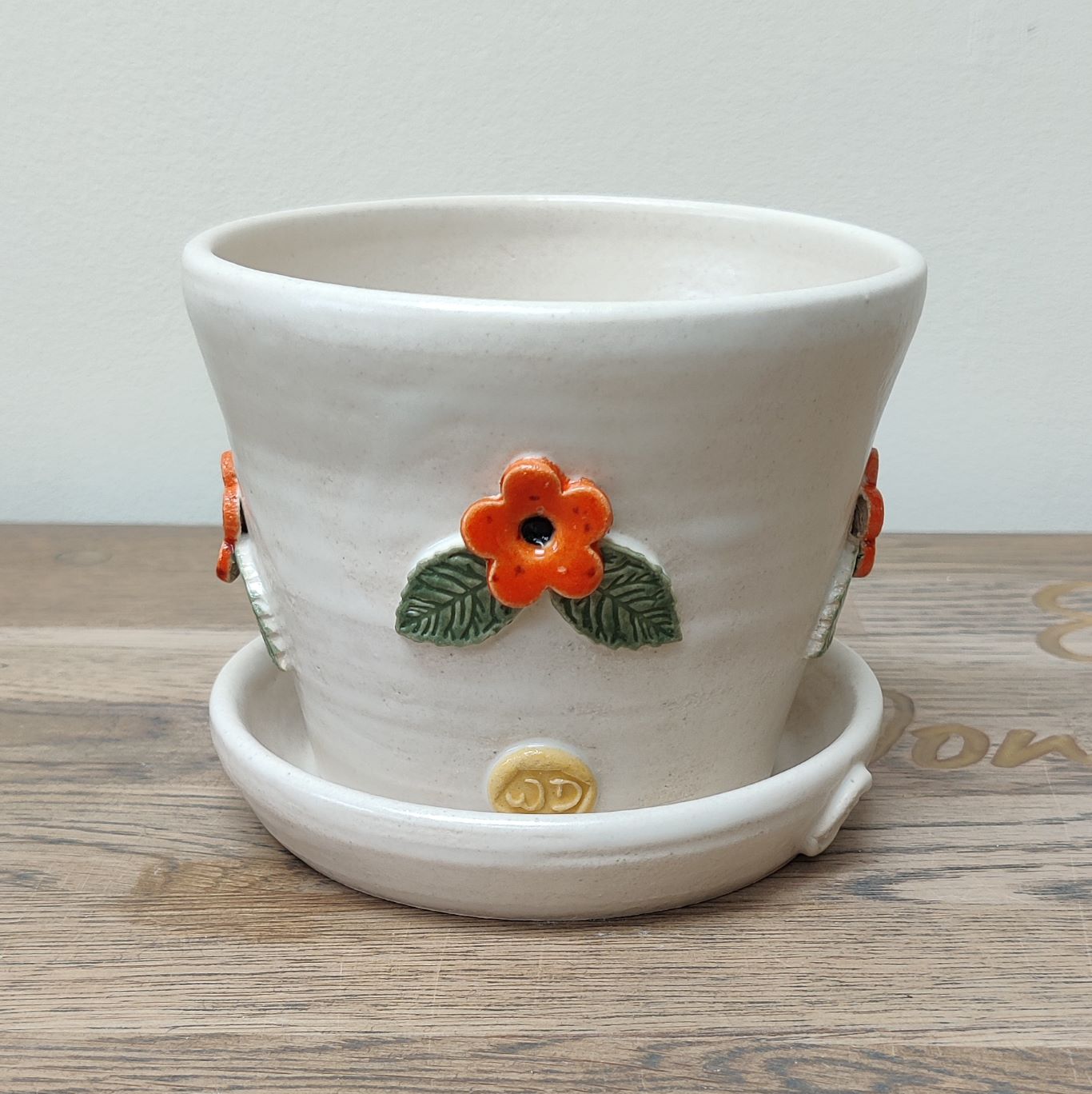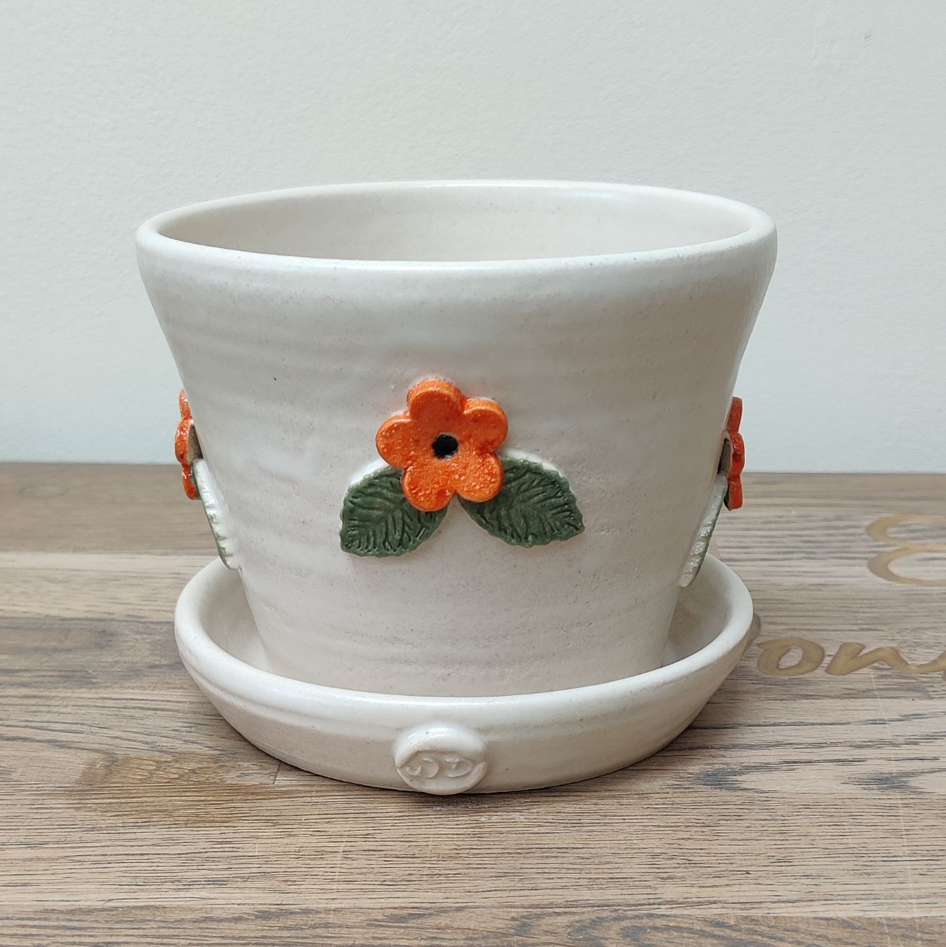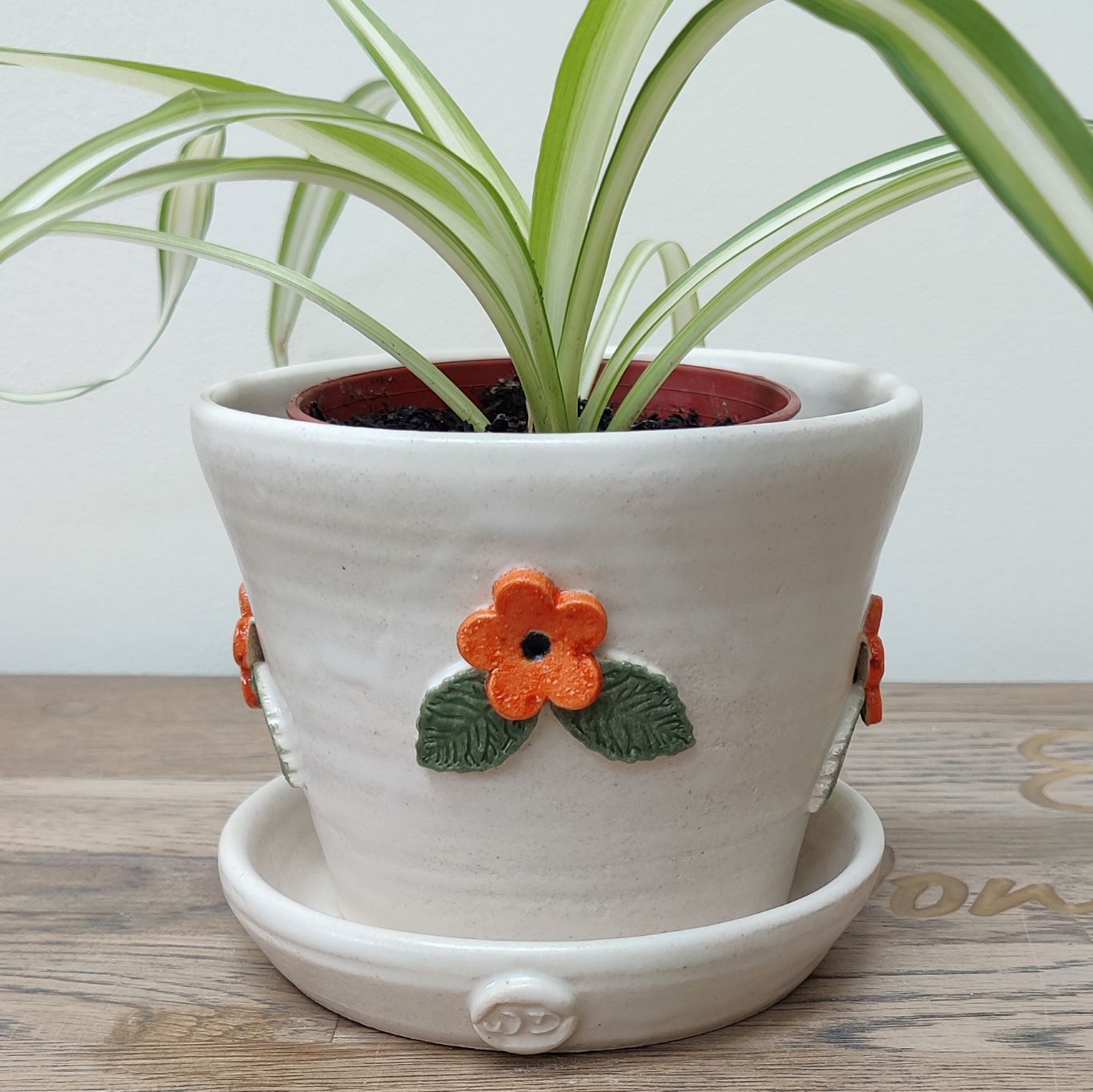 Unique handmade plant pot with matching saucer. Indoor use only. The pot has a drainage hole intended for your plant to be planted directly into the pot. This one of a kind plant pot is made from stoneware clay, fired to 1210C in an electric kiln and decorated with flowers. The pot and saucer is glazed with a white satin glaze and the flowers glazed with orange and green satin glazes.